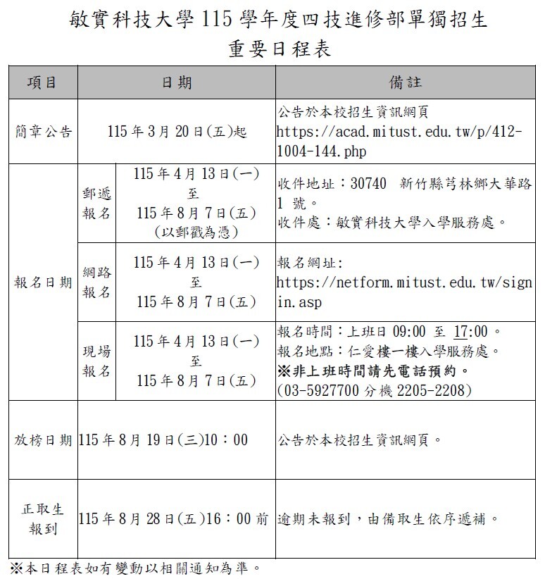 敏實科技大學115學年度四技進修部單獨招生簡章可免費自行下載運用。