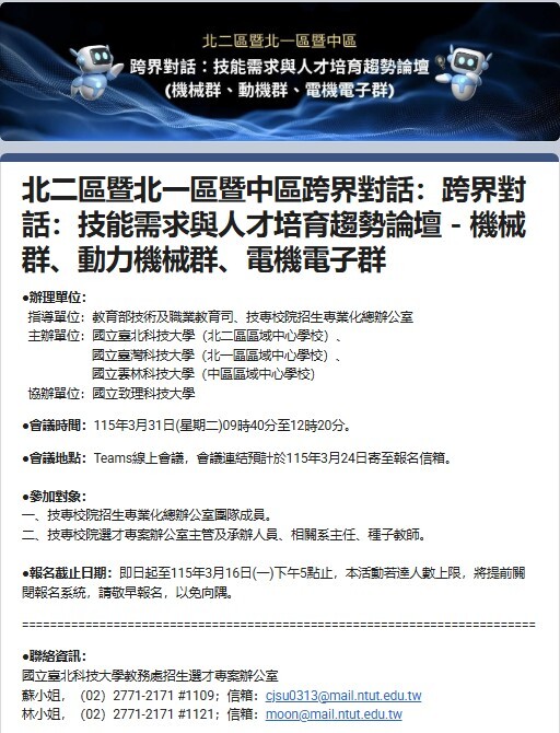北二區暨北一區暨中區跨界對話:技能需求與人才培育趨勢論壇-機械群、動力機械群、電機電子群本案活動訂於115 年3 月31 日(星期二)09時40 分至12 時20 分採Teams 線上會議舉辦,請選才專案辦公室主管及承辦人員、相關系主任(人工智慧學院)、種子教師報名參加,報名連結已公告群組(115 年度指標各系至少參加2 場)。